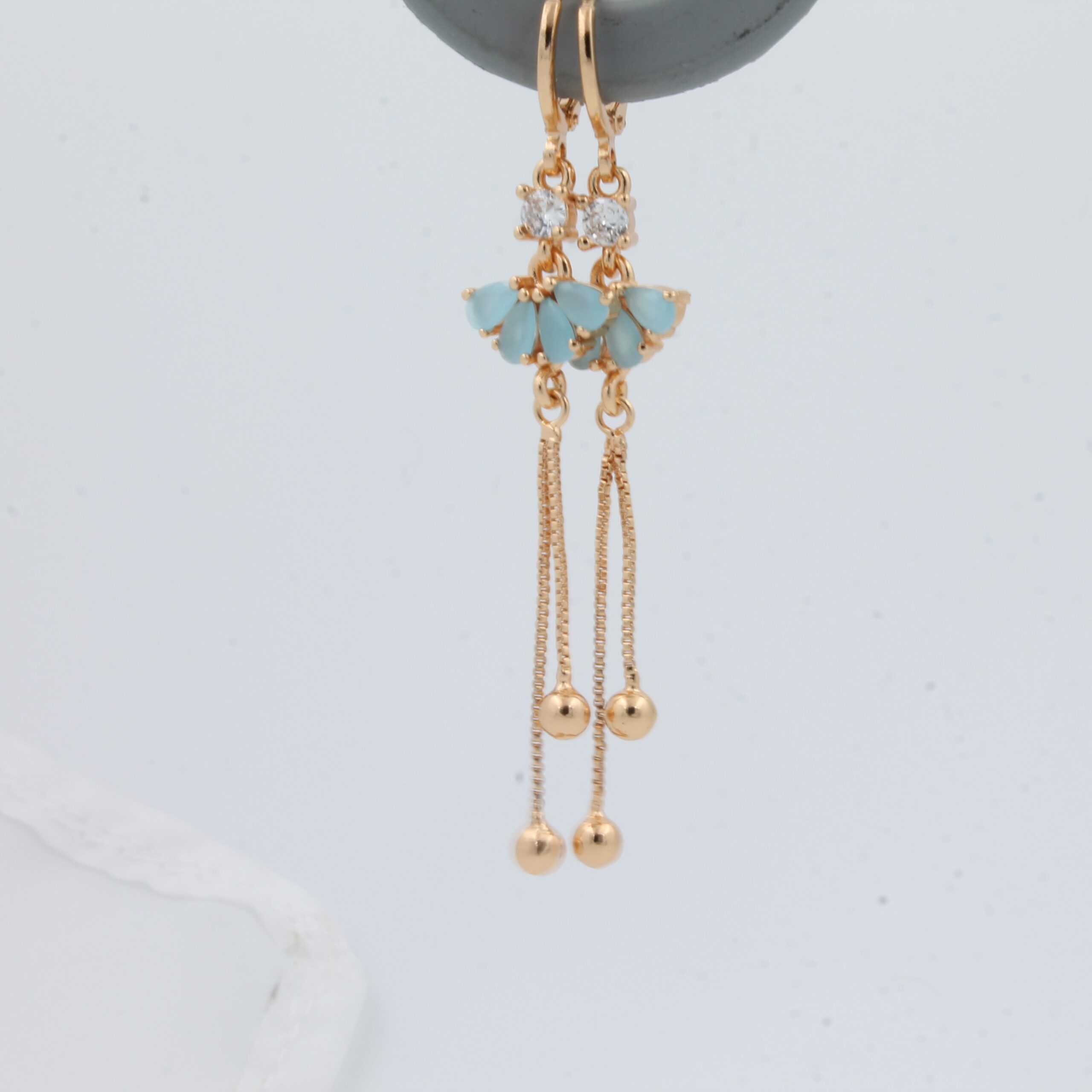 BEAUTIFUL SEA GREEN FLOWER WITH CHAIN DROP GOLDEN EAR RINGS.